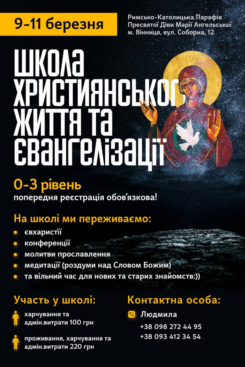Поглиблене знайомство з люблячим серцем Господнім, молитва та роздуми - це програма мінімум на Школі Християнського Життя та Євангелізації.Уці 3 дня на початку весни розпочнемо відкриватись на Божу волю в нашому житті то ж запрошуємо спільно з нами пройти цей час з 9 по 11 березня в нашій парафії. Контактна особа - Людмила 098 272 44 95, 093 412 34 54