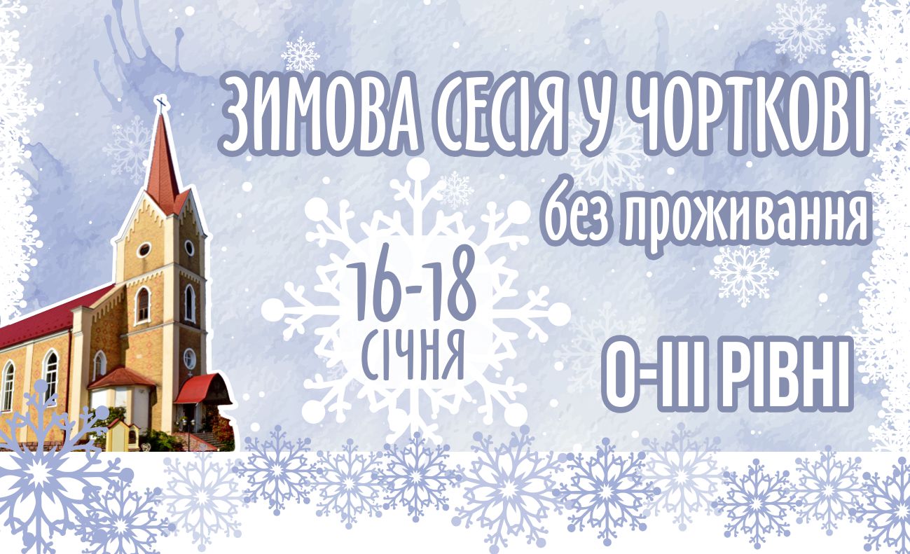 Друзі! Запрошуємо вас на зимову сесію для 0а (для тих, хто вперше), 0б, І, ІІ та ІІІ рівнів, яка відбуватиметься 16 – 18 січня 2026 р. за адресою: м. Чортків, вул. Монастирська, 1, кафе "Витанія" (на території храму Непорочного Зачаття Пресвятої Богородиці УГКЦ).